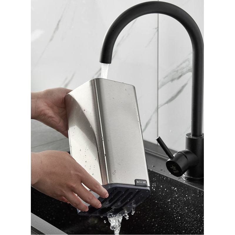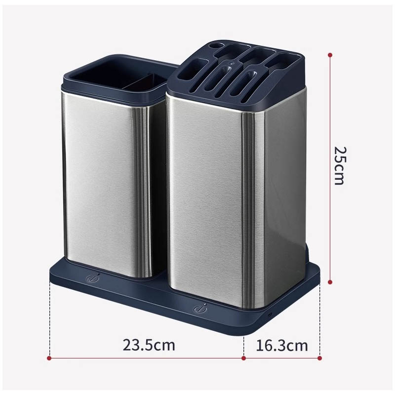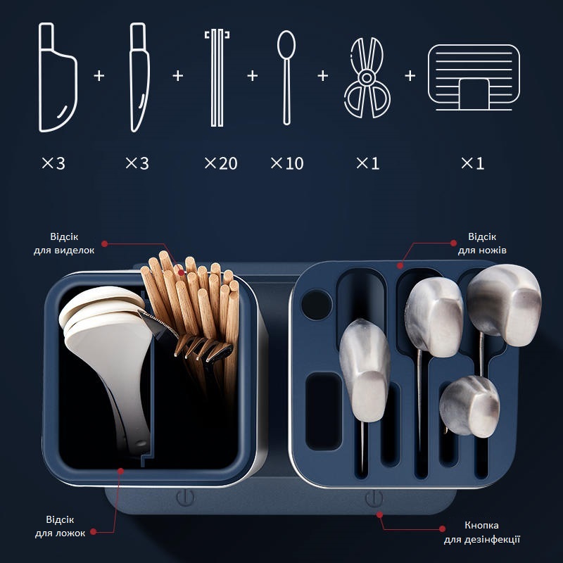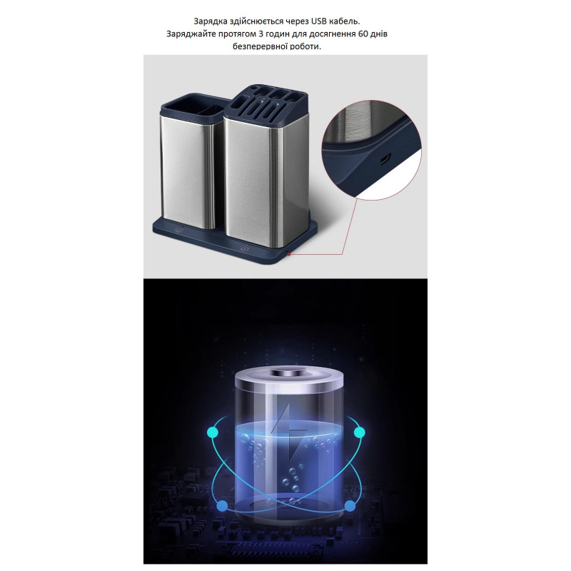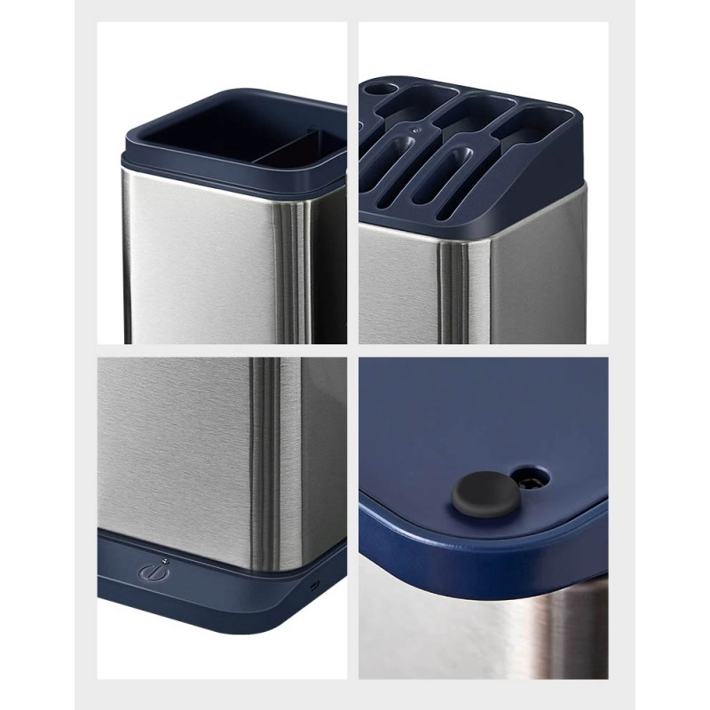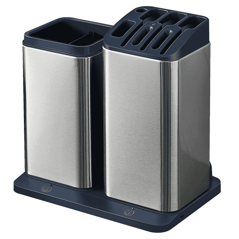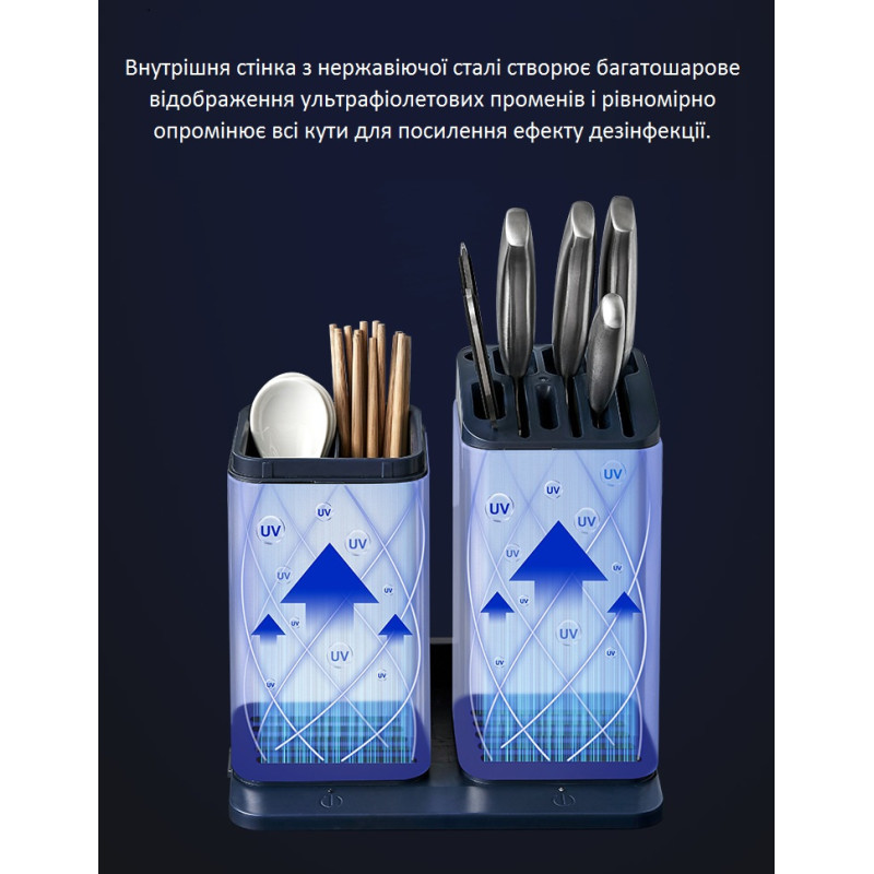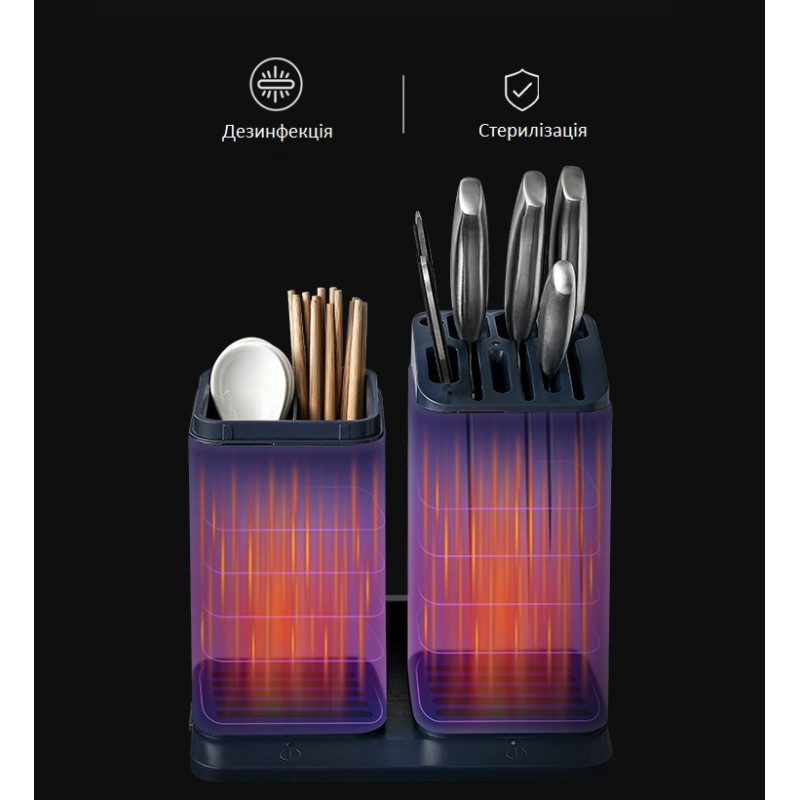 Багатофункціональний органайзер для кухонного приладдя забезпечує безпечне та зручне зберігання ножів, ложок, виделок та інших кухонних інструментів. Особливістю цієї моделі є вбудований УФ-стерилізатор, який знищує до 99,9% бактерій з поверхонь ножів та інструментів, гарантуючи їх максимальну гігієнічність. Продуманий дизайн органайзера допомагає раціонально використовувати кухонний простір, а протиковзка основа запобігає його переміщенню. Він легко миється і чудово доповнить інтер'єр кухні завдяки своєму сучасному мінімалістичному стилю.