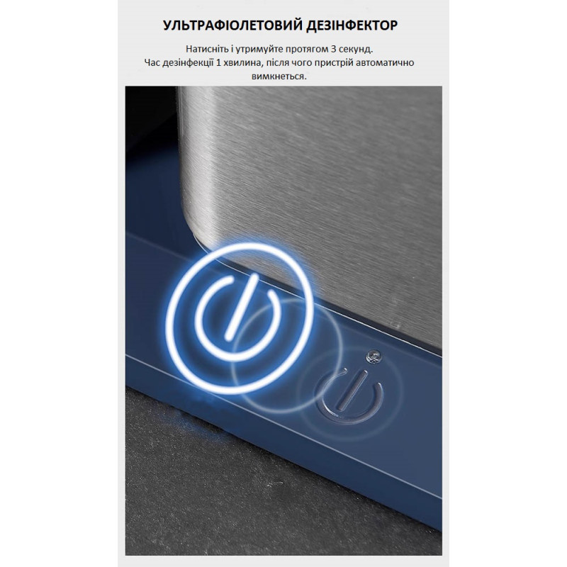 Вбудований УФ-стерилізатор для гігієнічної обробки, заряджається за 3 години через USB-кабель, заряду вистачає на 60 днів;