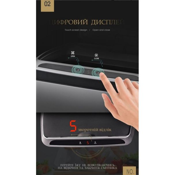 Після відкриття кришки йде зворотний відлік часу в 5 секунд, після закінчення відліку кришка закривається автоматично або натисканням на дисплеї OPEN x CLOSE. При знаходженні руки в області сенсора, кришка залишається відкритою до виходу із зони його дії.